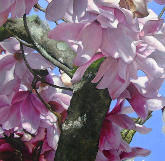Big painting, just over 120cm x 120cm. First colour layer on the branches, waiting for the first colour layer on the blooms.